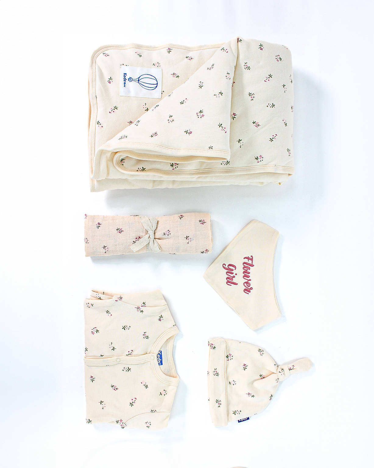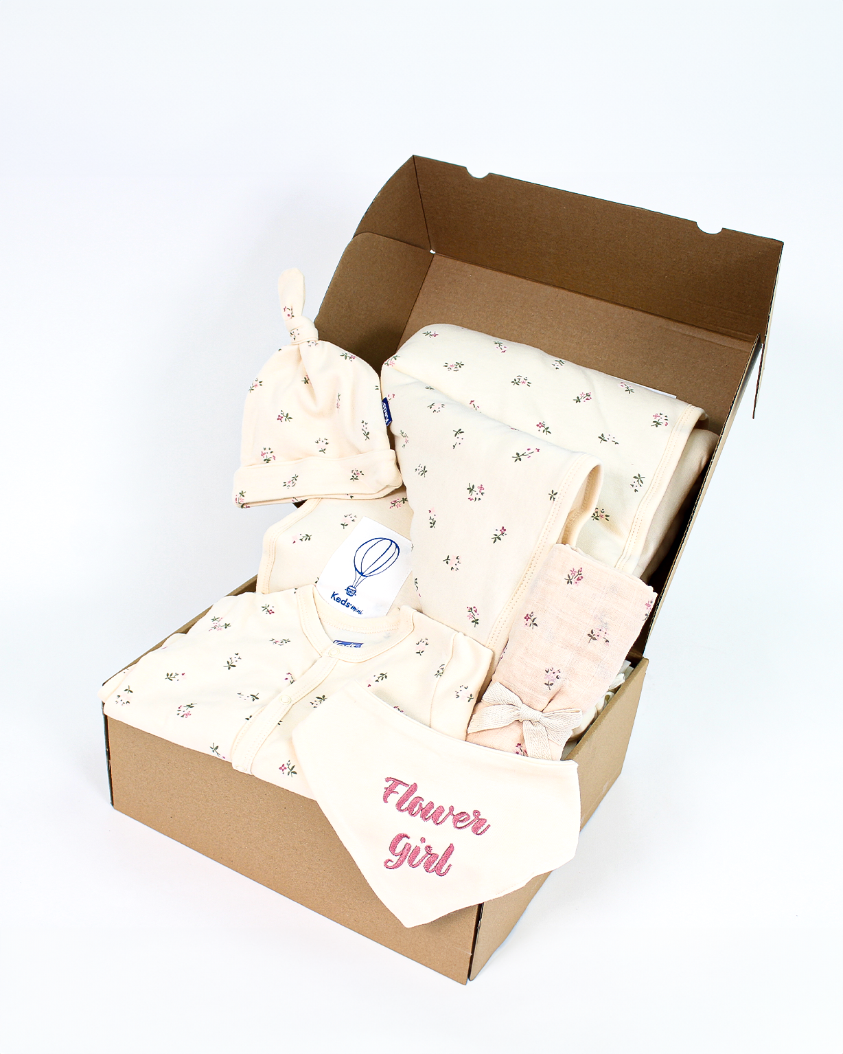 תכולת המארז: אוברול שרוול ארוך עם רגלית, שמיכה נעימה עם מילוי בגודל 80x80, חיתול טטרה 70x70 , סינר , כובע.